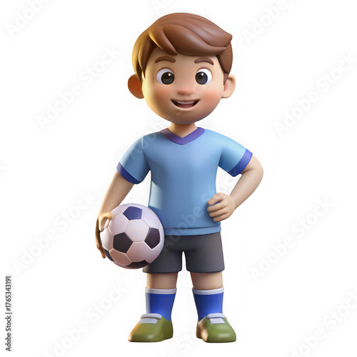 3 D cartoon boy in blue soccer uniform holding a ball isolated on a transparent background child
