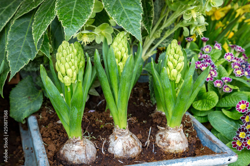3 heranwachsende, ungeöffnete Hyazinthen in einem Beet