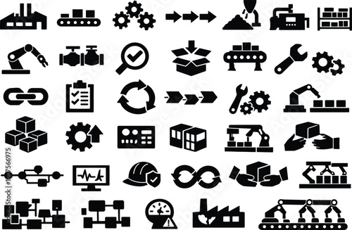 30 Manufacturing Process Solid Black Silhouette Icons Set on White Background