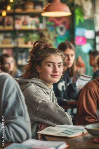 30. Portrait of a diverse group of students preparing for exams in a coffee shop, high detail, photorealistic, focused mood, well-lit environment