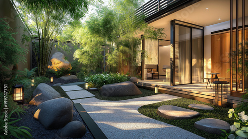 32. Asian-inspired house with a tranquil garden, bamboo, lanterns, and a zen rock garden