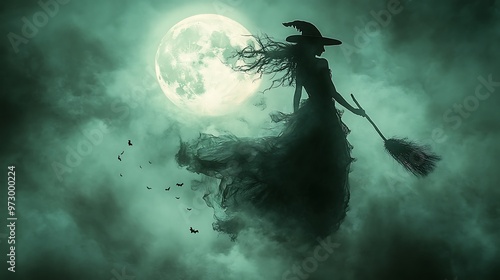 sorcerer, tall, black, hat, flying, broomstick, across, full, moon, eerie, fog, swirling, below, bat, following, closely, behind, her, water, blue, sky, underwater, sea, sun, light, abstract, night, ocean, nature, cloud, cloud, dark, space, texture, illustration, art, fish, halloween, dolphin