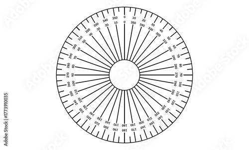 360 Degree Circular Protractor Diagram for Geometry, illustration of a full circle 360-degree protractor with precise markings for measuring angles, directions. Ideal for math, geometry, engineering