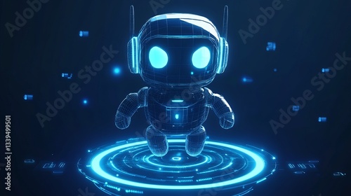 3D abstract AI robot floating above a neon light blue portal Technology innovation background Cute polygonal futuristic bot assistant Low poly wireframe vector illustration