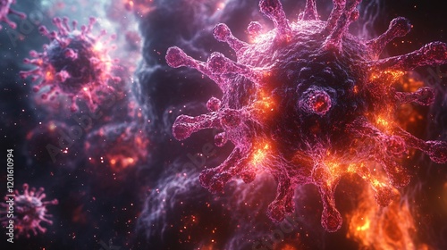 virus, three-dimensional, artistic, representation, cell, science, biology, medicals, molecular, infection, health, biotechnology, microbiology, abstract, colourful, visualisation, nature, microscopic, organic, environment, digital, technology, research, laboratory, innovation, design, structure, process, texture, energy, light, vibrant, graphic, concept, detail, illustration, study, dynamic, analysis, phenomena, density, exploration, creativity, visual, image