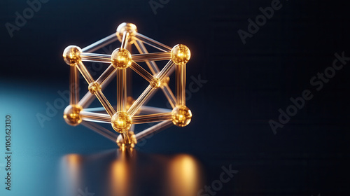3D atomic structure with glowing spheres and connecting lines, showcasing modern scientific concept in dark environment, evoking curiosity and wonder