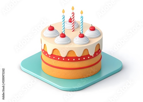 three-dimensional, birthday cake, icon, cake, birthday, sweet, dessert, food, chocolate, wedding, cream, party, vector, illustration, celebration, bakery, pink, happy, candle, decoration, delicious, pie, love, cupcake, holiday, sugar, decorated, cherry