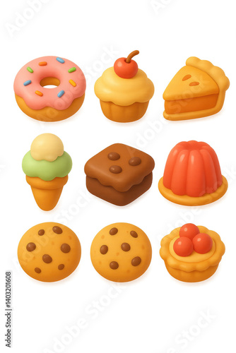 dessert, icon, three-dimensional, sweet, set, donut, cupcake, pie, ice, cream, cone, jelly, cookie, tart, brownie, sweet, snack, food, confectionery, treat, bakery, pastry, cherry, chocolate, sprinkle, gelatin, frosting, slice, delicious, whipped, topping, sugar, decoration, culinary, art, fun, playful, tasty, layer, cute, colourful, childlike, festive, party, chewy, soft, pudding