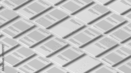 3d bright render background with a lot of abstract phones.