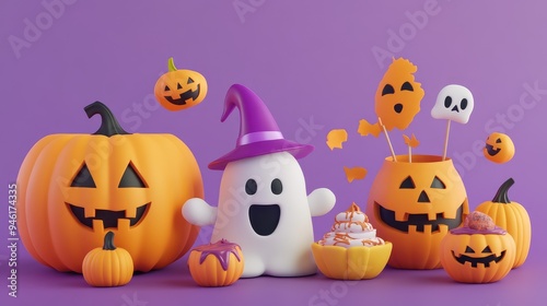 3D cartoon Halloween costumes and treats, with a clean, simple background and an abstract, playful design