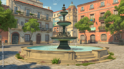 3d Cartoon of a classic fountain in the center city