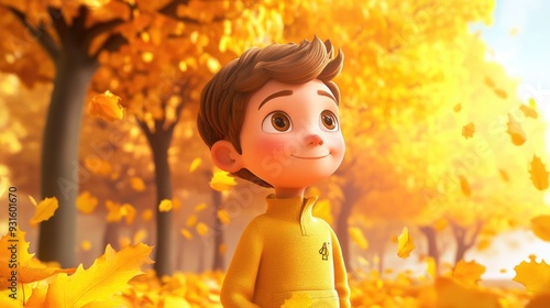 three-dimensional, cartoon, portrait, young, boy, colourful, autumn, park, vibrant, tree, gold, leaf, nature, children, fall, outdoors, animation, art, bright, scene, landscape, cheerful, fun, concept, joyful, creative, portraiture, imagination, beautiful, youth, playful