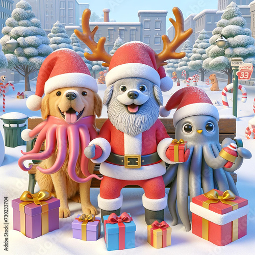 christmas, animal, santa, holiday, decoration, three-dimensional, character, design, house, home, winter, snow, illustration, cartoon, santa, christmas, new year, claus, cold, celebration, symbol, tree, boy, merry, dog, octopus, greeting, children, signs, happy, year, season, new, cute