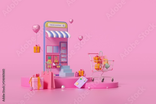 three-dimensional, cart, online, icon, gift, technology, shopping, cosmetic, phone, card, sale, reward, dais, retail, payment, bill, basket, pink, smartphone, buy, bag, mobile, credit, virtual, concept, box, display, store, template, app, advertisement, purchase, banner, refund, design, digital, stage, present, e-business, screen, transaction, item