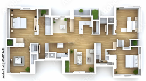 3D Floor Plan Shows Apartment Layout with Furnishings and Green Accents Effectively.