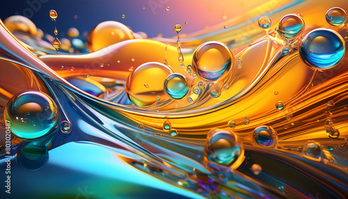 3D Flow of Liquid Oil, water bubbles with multi color on digital art concept.