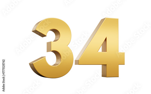 3D Golden number 34 Thirty four with a shiny metallic finish and sharp edges, 3d illustration