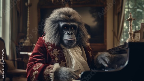 gorilla, noble, piano, pianist, curtain, window, room, rococo, attire, instrument, musician, aristocratic, wig, animal, 1700, baroque, three-dimensional, three-dimensional, bizarre, humorous, dressed, ancient, art, oil painting, portrait, mask, parody, clothes, ridiculous, ironic, grotesque, comic, satirical, awkward, caricature, funny, burlesque, travesty, absurd, picturesque, painting, drawing, picture, poster, closeup, closeup