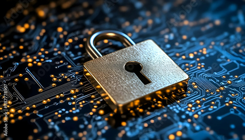 3D Illustration, Cybersecurity, Data Protection, Padlock on Circuit Board