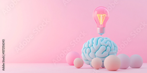 3D illustration featuring stylized brain with glowing light bulb above it, set against pink background. scene evokes creativity and innovation