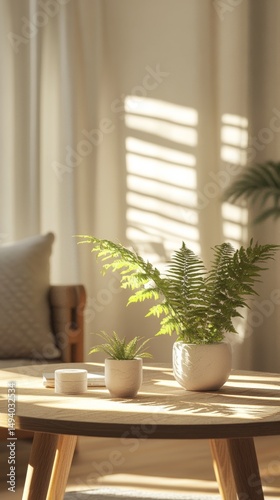 3D illustration of a cozy living room table with fern leaves on the side, bathed in natural sunlight, creating a perfect setting for product showcasing with a serene and earthy atmosphere
