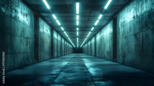 3D Illustration of a Dark Concrete Corridor with Glowing Blue Lights