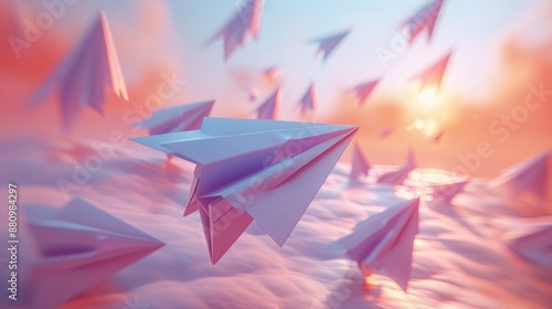 3D illustration of a successful business idea featuring a prominent large red paper airplane leading many small white paper airplanes, all rushing in the same direction on a plain background with
