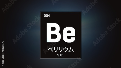 3D illustration of Beryllium as Element 4 of the Periodic Table. Grey illuminated atom design background orbiting electrons name, atomic weight element number in Japanese language