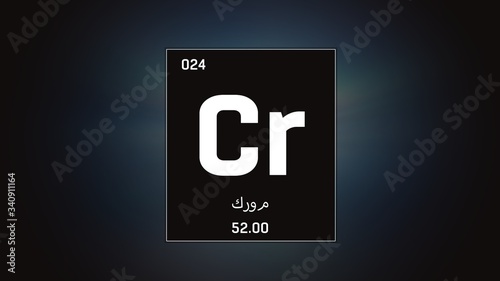 3D illustration of Chromium as Element 24 of the Periodic Table. Green illuminated atom design background orbiting electrons name, atomic weight element number in Arabic language