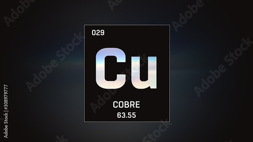 3D illustration of Copper as Element 29 of the Periodic Table. Grey illuminated atom design background with orbiting electrons. Name, atomic weight, element number in Spanish language