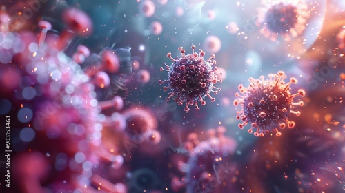 3D illustration of coronavirus particles, depicting the structure and spread of the virus in a cellular setting