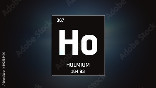 3D illustration of Holmium as Element 67 of the Periodic Table. Grey illuminated atom design background with orbiting electrons. Design shows name, atomic weight and element number