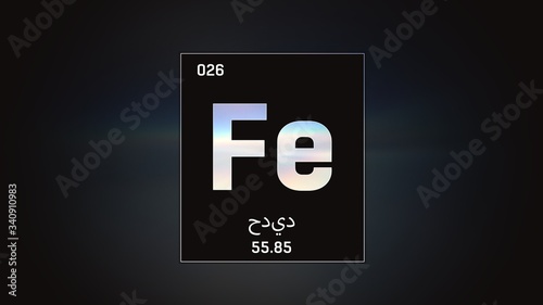 3D illustration of Iron as Element 26 of the Periodic Table. Grey illuminated atom design background orbiting electrons name, atomic weight element number in Arabic language