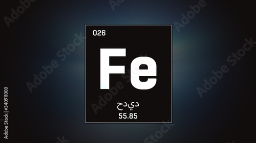 3D illustration of Iron as Element 26 of the Periodic Table. Grey illuminated atom design background orbiting electrons name, atomic weight element number in Arabic language