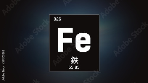 3D illustration of Iron as Element 26 of the Periodic Table. Grey illuminated atom design background orbiting electrons name, atomic weight element number in Japanese language