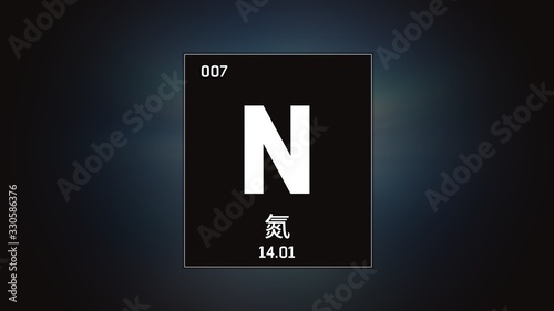 3D illustration of Nitrogen as Element 7 of the Periodic Table. Grey illuminated atom design background orbiting electrons name, atomic weight element number in Chinese language