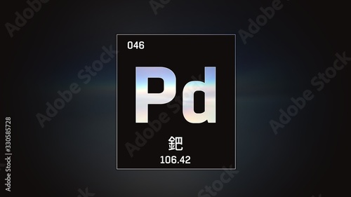 3D illustration of Palladium as Element 46 of the Periodic Table. Grey illuminated atom design background orbiting electrons name, atomic weight element number in Chinese language