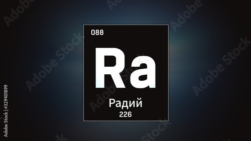 3D illustration of Radium as Element 88 of the Periodic Table. Grey illuminated atom design background with orbiting electrons name atomic weight element number in russian language