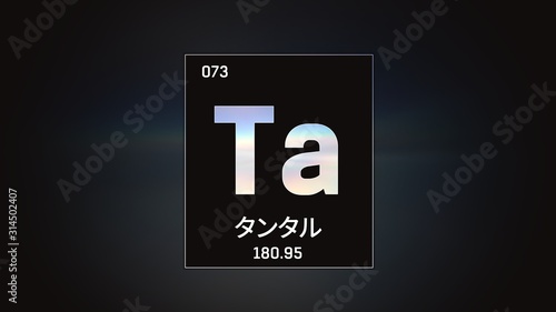 3D illustration of Tantalum as Element 73 of the Periodic Table. Grey illuminated atom design background with orbiting electrons name atomic weight element number in Japanese language