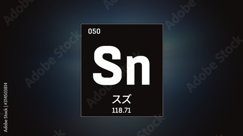 3D illustration of Tin as Element 50 of the Periodic Table. Grey illuminated atom design background orbiting electrons name, atomic weight element number in Japanese language