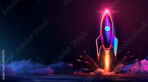 3d illustration rocket space colorful holographic in dark background for Business start up and science concept