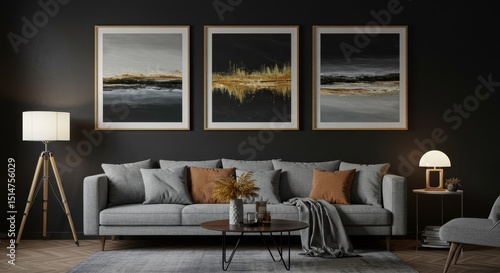 3D Illustration Warm Living Room with Gray Sofa Lamp and Decorative Art