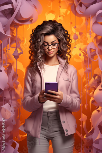 3d illustration, young woman student standing on surreal colored background, teenager while using a smartphone. Concept of youth entertainment and cell phone use in streaming, leisure time