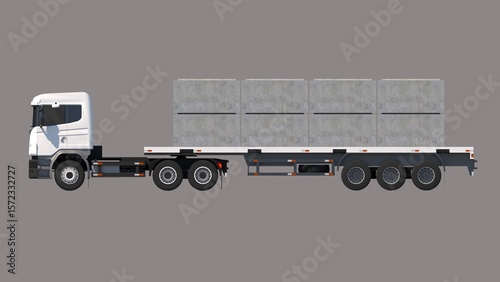 three-dimensional, architecture, bulk, cargo, commercial, concrete, construction, construction industry, construction site, culvert, delivery, digital artwork, distribution, hard-wearing, efficient, engineering, freight, grey, heavy machinery, industrial, industry, infrastructure, large, logistic, massive, material, modern, no people, realistic, rendered, semi-truck, shipping, half face, strong, trailer, truck, trucking, vehicle