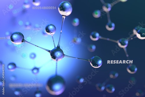 3d image of floating molecules, science background with white text of research and series of numbers, macro shot