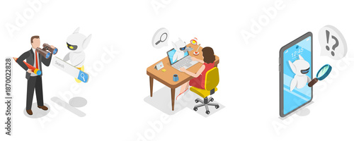 3D Isometric Flat Illustration of AI Search, Artificial Intelligence Robot Answer Questions