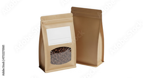 three-dimensional, hot drink, bag, paper, cardboard box, food, bean, window, pouch, racked, up, product, realistic, render, clean, design, commercial, use, stock, asset, isolated, object, transparent, background, brown, retail, storage, beverage