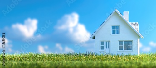 3D luxury white miniature house on green grass under blue sky for real estate promotions with ample empty space for customizable text