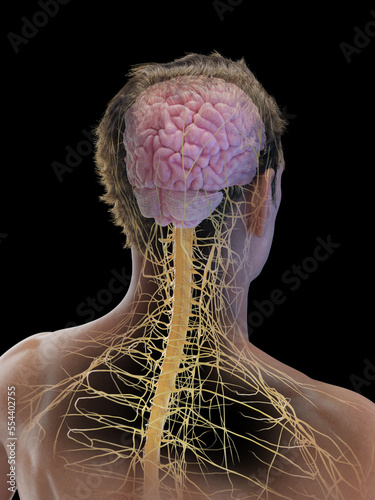 three-dimensional, rendering, illustration, artwork, graphic, medicals, medicine, human, anatomy, anatomical, biology, physiology, male, man, organ, internal, inside, transparent, x-ray, on black, posterior, brain, spinal, cord, cerebra, central, nervous, system, nerve, fiber, neurology, nerve cell, impulse, signal, intelligence, movement, sensory, lobe, science