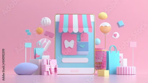 3D Minimal online shopping on smartphone application service, digital marketing, online buying, and online payment, summer or big sale, payment, discount for credit, 3D render, Generate AI